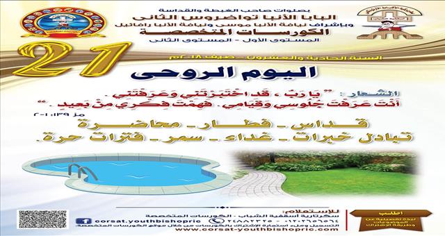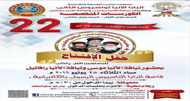 شهد قداسة البابا تواضروس الثاني مساء السبت حفل ختام المستويين الأول والثانى للكورسات المتخصصة بأسقفية الشباب والذي أقيم بمسرح الأنبا رويس بالكاتدرائية المرقسية بالعباسية.