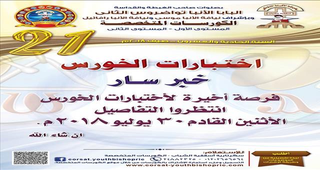 قد بدأت إمتحانات كورس إستخدام التكنولوجيا فى الخدمة من يوم الجمعة ٢٧-٧-٢٠١٨ بمركز الأنبا رويس للكمبيوتر بالكاتدرائية المرقسية بالعباسية